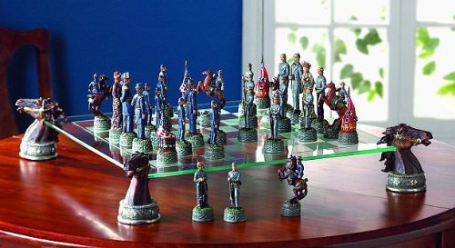 Each piece of this remarkable set is a miniature work of art, marching across a frosted-glass "battlefield". Lifelike horse-head corner columns hold the board aloft. A truly theatrical twist on the classic game of strategy and an absolute "must" for Civil War collectors and chess fanatics alike! Comes complete with polystone pieces and etched glass board. Each playing piece is approximately 1-5/8" diameter x 5-5/8" high. Board is 21-1/2" diameter x 1/2" thick. Each corner column is 3-1/8" x 4-1/2" x 5" high. Read more...